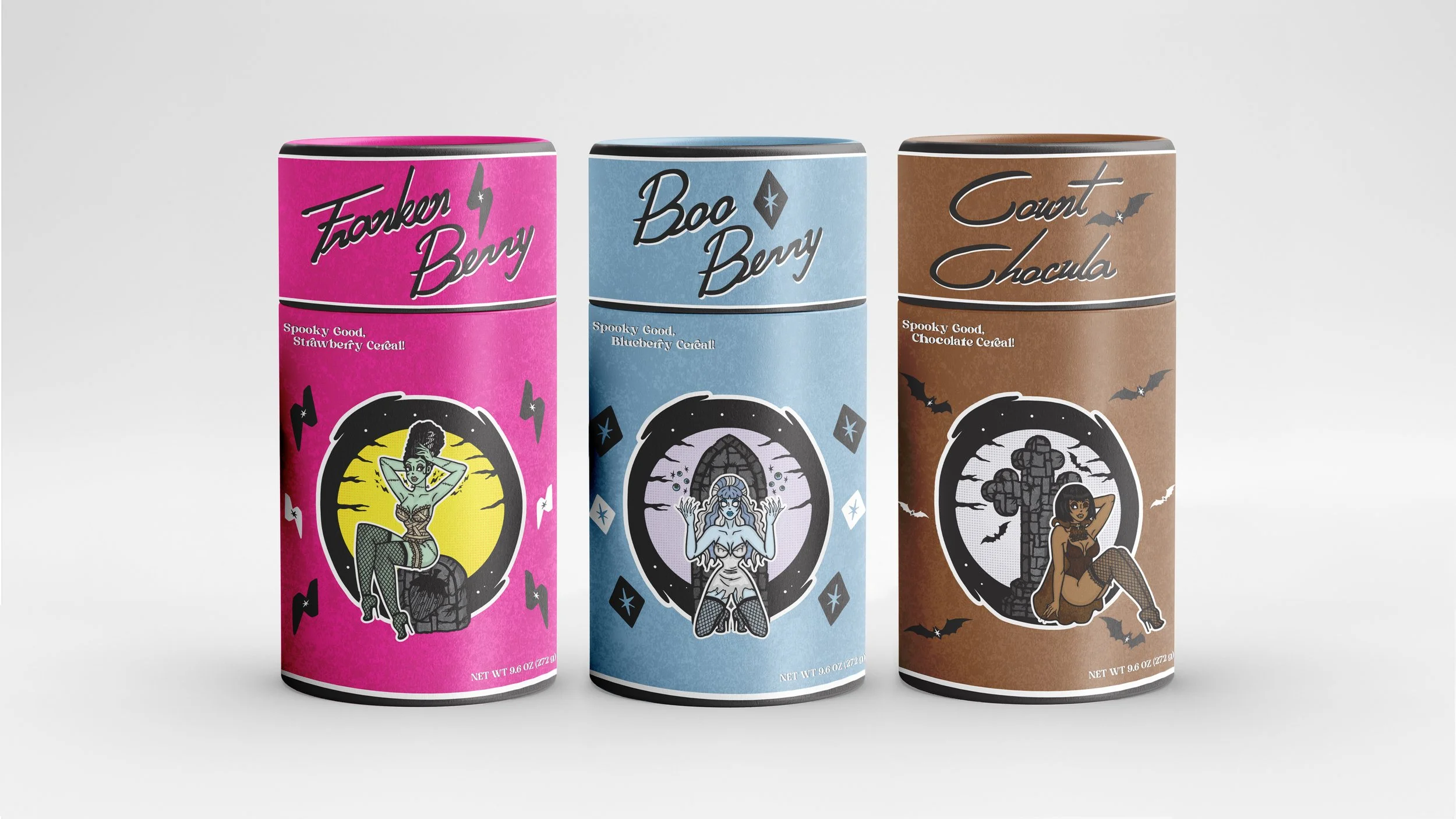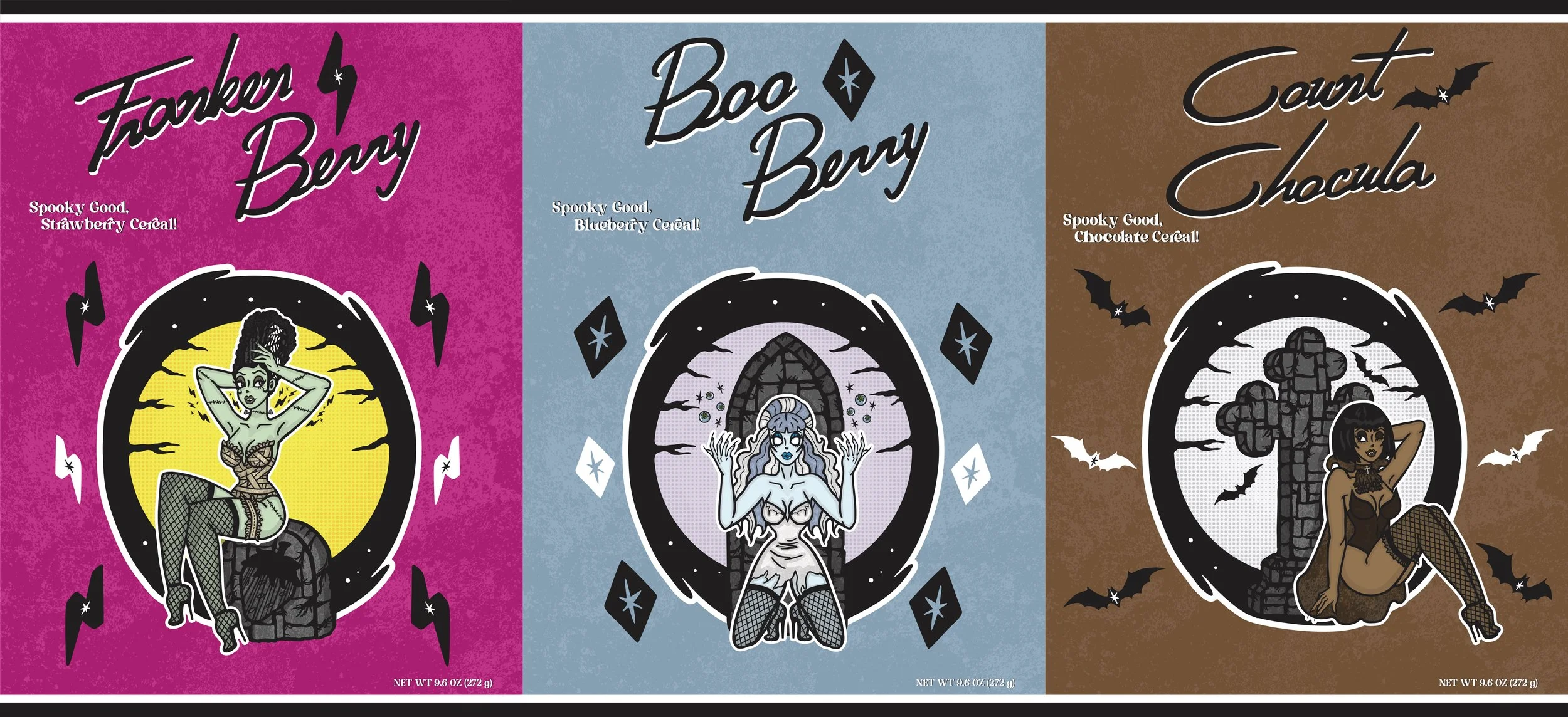 My goal was to redesign General Mill's "Monster Cereals", and their various flavors, "Frankenberry", "Boo Berry", and "Count Chocula." Instead of the current cartoony, bright, and abstracted male characters that the company presently uses for their branding, I opted for a 1950's classic pinup theme, utilizing all-female characters. For the packaging itself, instead of a box, I decided upon more vintage-feeling cylindrical tube containers. Of course, instead of tin (as they would have been in the 50's, these are cardboard). The characters I created to replace the old are "Frankenberry the Frankenstein", "Boo Berry the Ghoul", and "Count Chocula the Vampire". Each come with their own attitude, flavor, and theming for their package. I also drew the characters in sequential style, each pose pointing the viewer in a different direction, evoking movement flowing through the works. These girls were so fun to make; I absolutely adore pin-up art, and pastels! This rebranding is very retro-fashioned, done in a modernistic way.